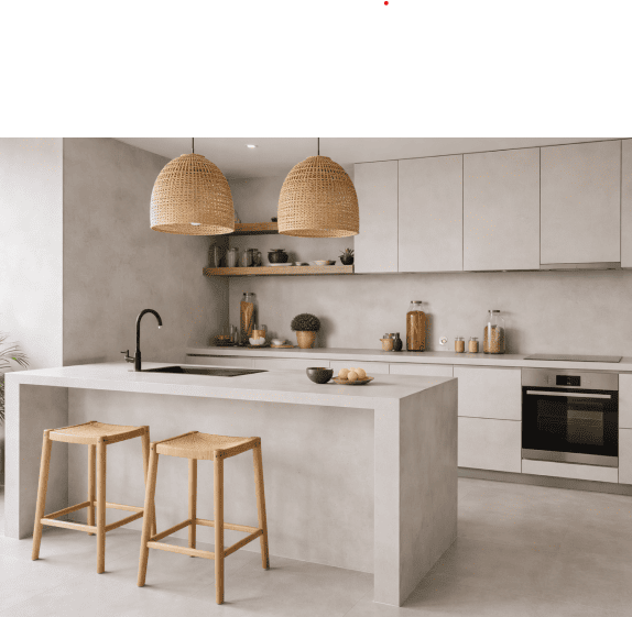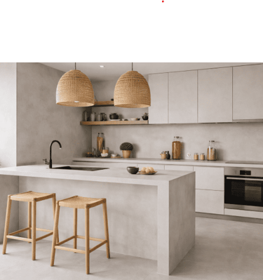 Referencias de acabados en cocinas, baños y microcemento.
